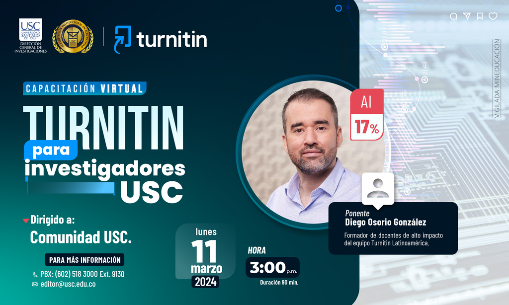 La Universidad Santiago de Cali y la Dirección General de Investigaciones (DGI) tienen el agrado de extender una cordial invitación a todos los miembros de la comunidad santiaguina a participar en la próxima capacitación virtual sobre Turnitin